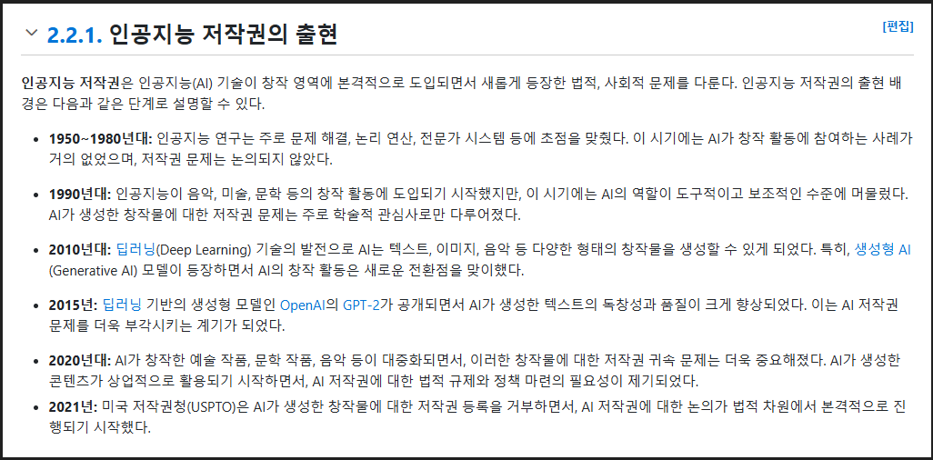 - 대부분의 국가에서는 AI가 생성한 콘텐츠를 법적으로 창작물로 인정하지 않음